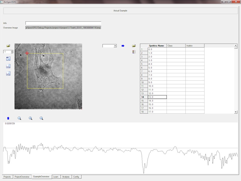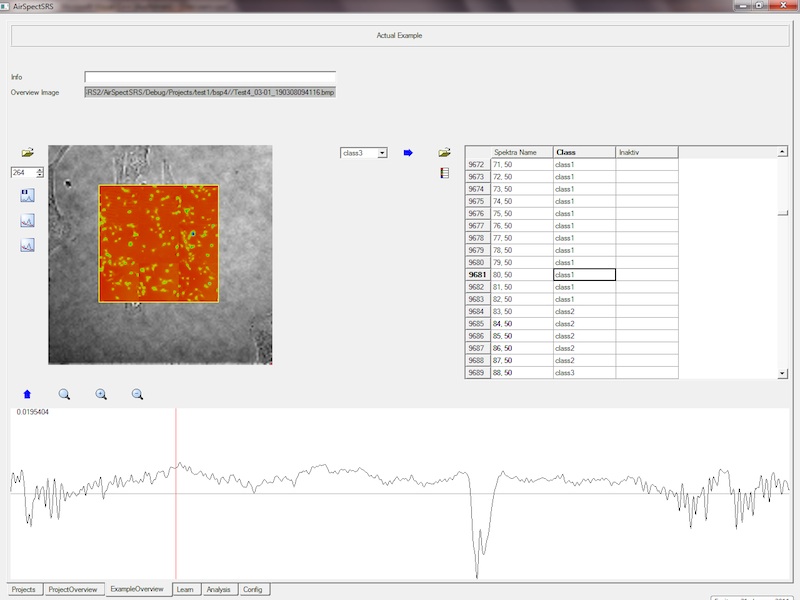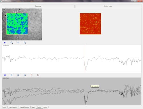 Class assignment of pixels and the corresponding spectra via a graphical selection tool.